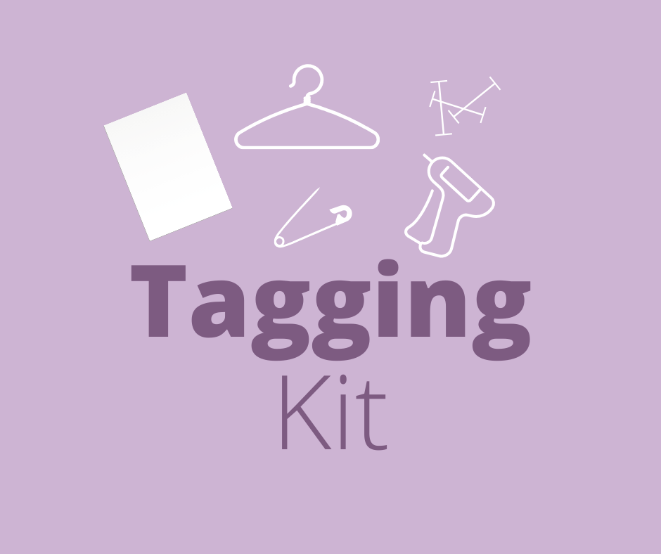 100 child sized wire hangers, tagging gun, 1,000 barbs, 100 safety pins and 25 sheets of card stock in a reusable JBF tote
